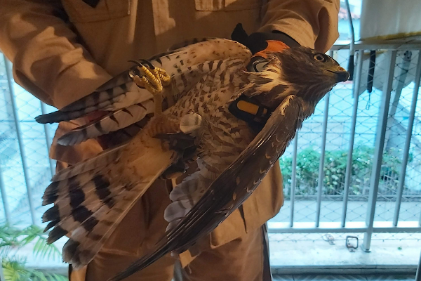 O gavião acuado se enganchou na tela de proteção da sacada. Resolvi ligar o 193, Corpo de Bombeiros. Fui bem atendida. Em 10 minutos, uma equipe chegou.